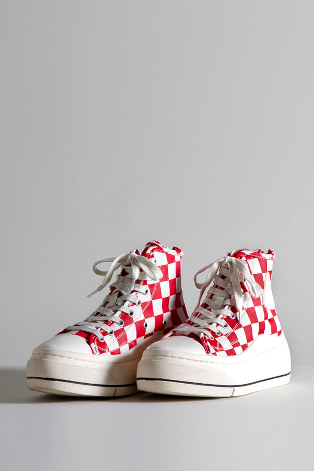 Classic Canvas high-top sneaker with lace-up closure, hand stitched platform and toe cap. ONLINE EXCLUSIVE Color: Red Checker Round leather white/white cap toe and white platform Lace-up closure Signature R13 logo on side Imported R13S5029-S022A DETAILS Heel Height: 2.5", 65 mm Platform Height: 1.6", 4 cm Shaft Height: 4.1", 10.5 cm Based on size 10; slight variations may occur by size.