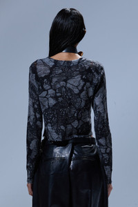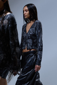 Shrunken cashmere cardigan featuring a black lace print. DETAILS Color: Black Lace 100% Cashmere R13WY041-Y226A Imported