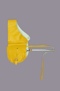Over shoulder saddle bag built from color blocked leather and featuring buckled wrap around straps. DETAILS Color: Yellow and Aqua 100% Leather R13WA059-S203A Imported