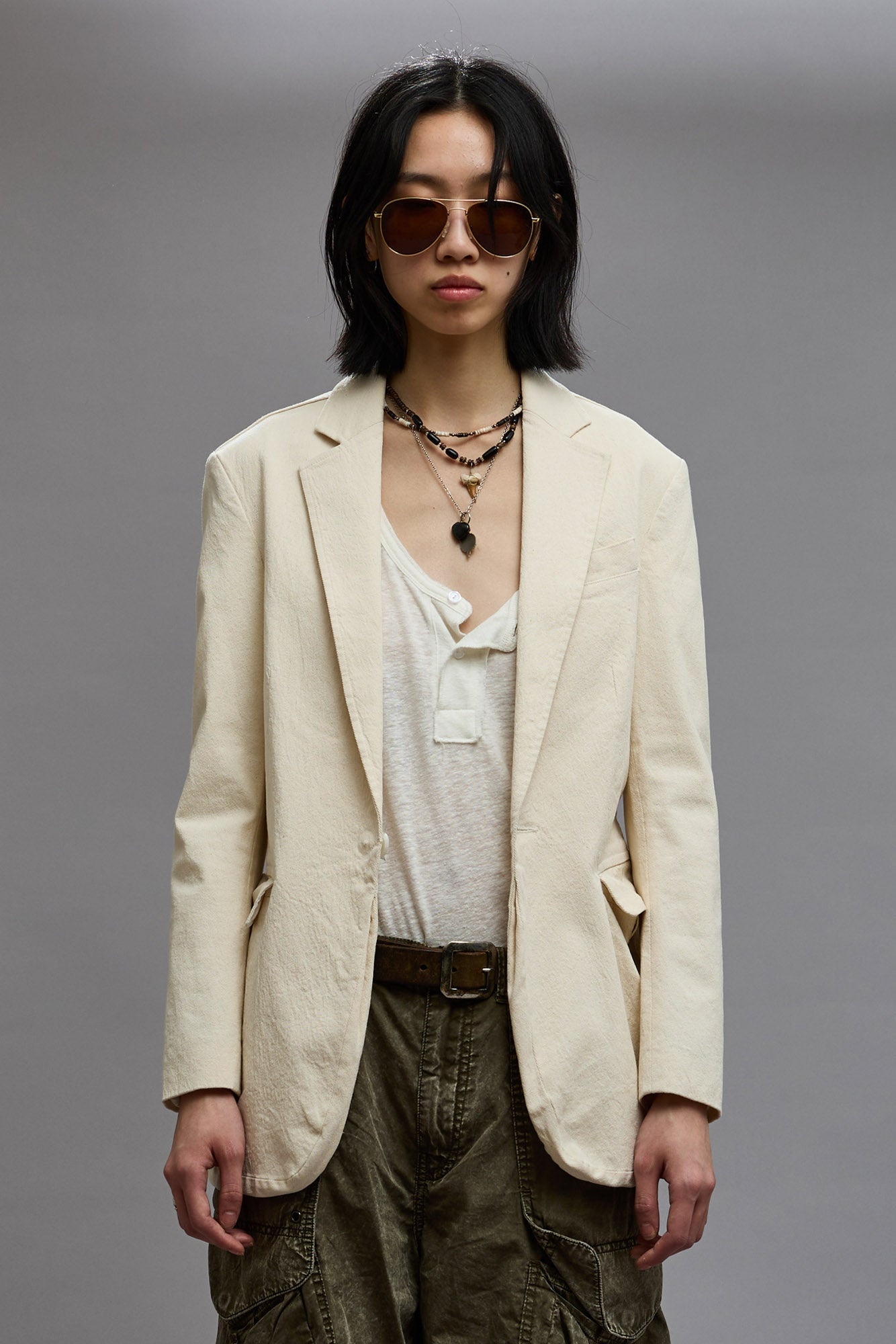 Shrunken Blazer built from Italian Crinkle Cotton Cupro Twill, featuring box pleated pockets that add volume to the lower half of the garment and puff out around the hips. - MADE IN ITALY - Color: Natural - 71% Cotton; 27% Cupro; 2% Elastane - R13WR275-R359A
