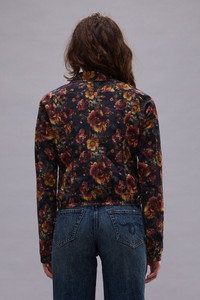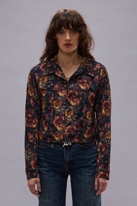 Slim fit trucker jacket with joined body and sleeve panel built with an 8 oz french velour stretch fabric printed with a floral motif and treated with a simple garment wash. DETAILS Made in Italy Color: Navy Blue Floral Velveteen 98% Cotton, 2% Polyurethane R13WD206-D384A