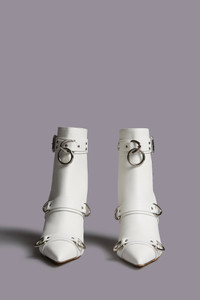 Leather ankle heeled boot with harness straps throughout. DETAILS Heel Height: 3.75", 95 mm Shaft Height: 5.9", 15 cm Shaft Circumference: 7.87", 20 cm Based on size 40; slight variations may occur by size. Made in Italy Color: White 100% Leather R13S081-S239A