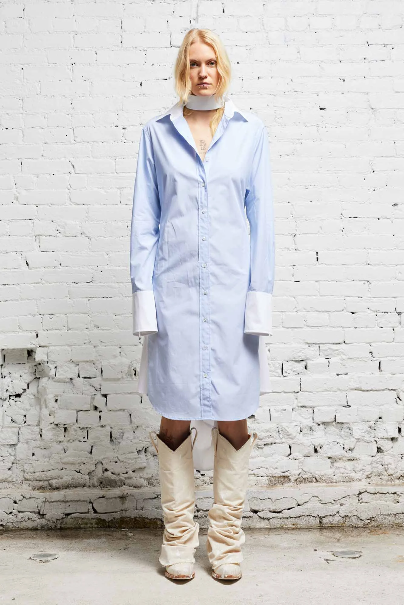 Relaxed shirtdress constructed with two shirts sewn together. The bottom shirt's arms can be tied around the front or back of the waist. - Color: Blue and White - 100% Cotton - Sasha is 5’10” and wearing size M - Bust 32”; Waist 23”; Hips 35” - R13WR182-R280B - Imported