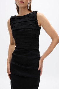 For maximalist dressing, the Adela Gown is the perfect timeless piece. A vision in black taffeta, this elegant silhouette is brought to life with skilled ruching throughout the fitted bodice. The boatneck and skimming pencil skirt add to the sleek factor. - Fitted bodice with internal boning - Fits true to size - A slim fit silhouette - This fabric has stretch - Adjustable elastic waist tape to cinch in the waist - This style can be hemmed - This style fits true to size Size and Fit Runs true to size, we recommend taking your usual size. Model is 5'10 and wears a Rachel Gilbert Size 1 [AU/UK 8 | US 4] Fabrication Stretch Taffeta 45% Nylon 50% Polyester 5% Elastane Care Dry Clean Only See sewn in label for further care instructions
