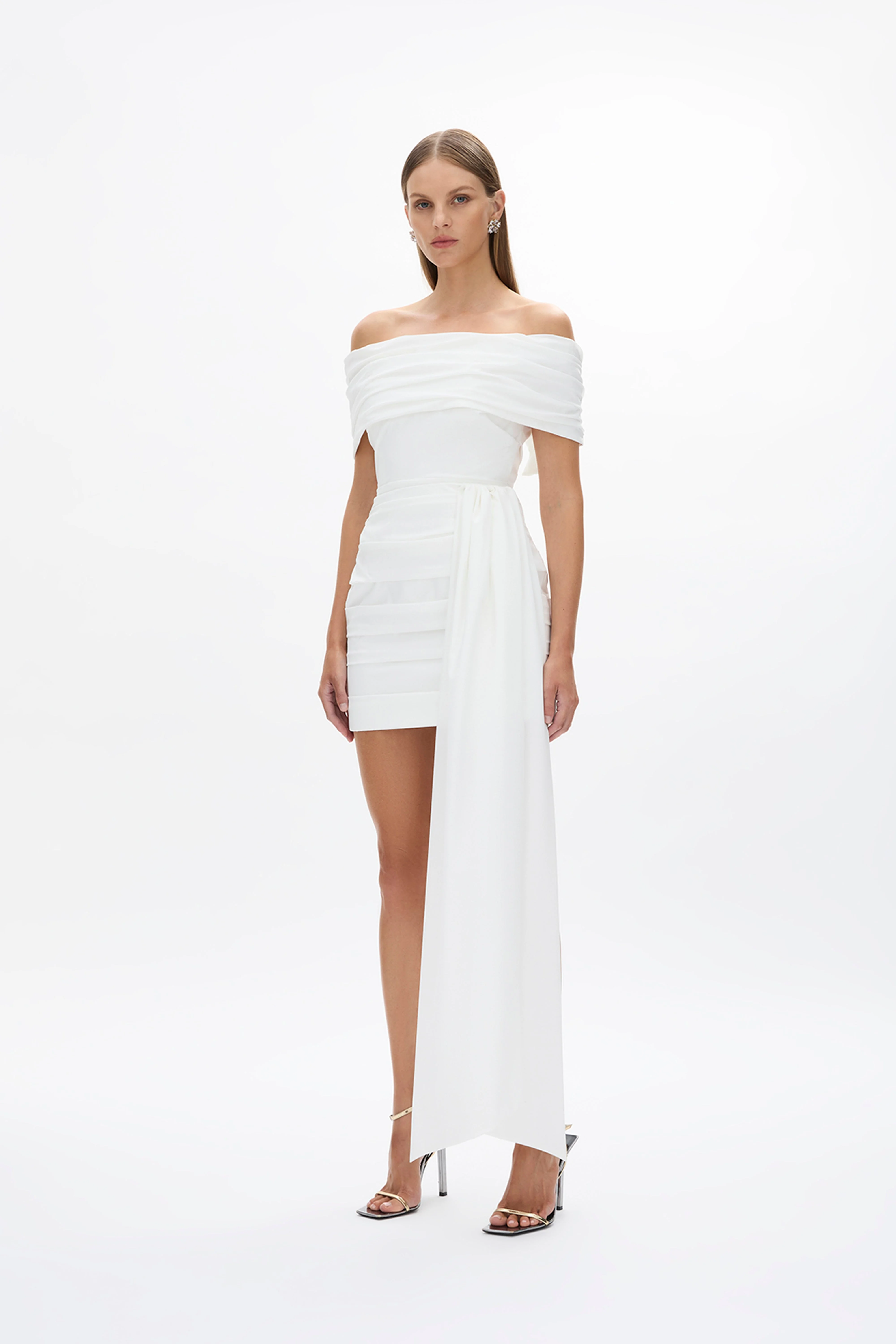Details & Fit This style runs true to size, we recommend taking your bust and waist measurement to indicate your size. Model is 5'9 and wears a RG 1 = US 4 = AU/UK 8. Heel height is 12 cm. - Figure hugging fit - Matte stretch taffeta fabric drapes over stretch lining base - Fabric is tucked to create flattering drape over body - Internal lining layers and fully boned corset inside bodice - Elasticated waist tape - Covered open ended zip at centre back - Split at centre back skirt hem - Drape panel around neckline and over shoulder - Restricted movement across arms Fabric & Care Stretch Taffeta Main: 88% Polyamide 12% Elastane Lining: 100% Polyester Dry clean only See sewn in label for further care instructions