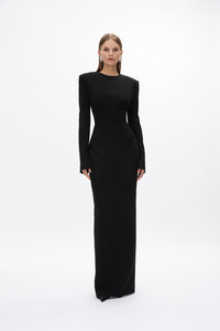 Details & Fit This style runs true to size, we recommend taking your waist measurement to indicate your size. This silhouette is designed to be form fitting through the waist and hip. This garment can be altered with ease. The length of the dress and sleeves can be tailored by a professional seamstress. Model is 5'10 and wears a RG 1 = US 4 = AU/UK 8. Heel height is 11 cm. Dress length is 129 cm from under bust. - Textured fabrication - Bodice gathers at under bust seam - Waist panel with fully boned corset - Shaped design panel seams over hip to create flattering lines over body - Elasticated waist tape - Invisible zip at centre back - Fully lined - Shoulder pads - Bias cut sleeves - Split at centre back skirt - Elongated knuckle length sleeve Fabric & Care Stretch Crepe Main: 98% Polyester 2% Spandex Lining: 100% Polyester Dry clean only See sewn in label for further care instructions