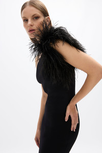 Crafted from a thick, stretch knit fabric featuring a one shoulder neckline and a full length, slim fit. The Elcie Gown features black feather detailing across the shoulder for an effortlessly chic feel. Perfectly paired with the Franky Bag in green. Size and Fit Runs true to size, we recommend taking your usual size. Model is 5'9 and wears a Rachel Gilbert Size S [AU/UK 8 | US 4] - Detachable feathers - Back split detail with side zip - Store flat - Cannot be hemmed Fabrication 63% Viscose 37% Nylon Fabric is a stretch knit Ostrich feather shoulder detail Care Gentle hand wash Dry cleanable Feathers are removable for laundering