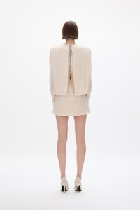 Details & Fit This style is true to size; we recommend using your bust, waist, and hip measurements to select the size that most closely matches our size chart.Model is 5'9 and wears size RG 0 / US 2 - Mini silhouette - Rounded neckline - Fitted internal bodice long sleeve top - Relaxed top with form-fitting skirt - Internal shoulder pads for structure - Hand-placed embellished trim on back - Long batwing-style sleeves at wrist length - Clasp closure Fabric & Care Crafted from an opulent satin, the Florida Mini offers a smooth, soft hand feel while providing structure that maintains the clean lines of the shift silhouette. The fabric drapes effortlessly across the body, allowing the relaxed top to flow naturally over the fitted skirt. Its gentle sheen adds a refined, luminous quality, enhancing the subtle artistry of the hand-placed embellishment. The satin’s natural weight supports the internal structure, ensuring the dress holds its shape while remaining comfortable and easy to wear. To protect the delicate embellishment, avoid friction against textured surfaces and take care with jewellery or accessories that may catch. Store in a garment bag and hang with internal support loops to preserve both the fabric and detailing.