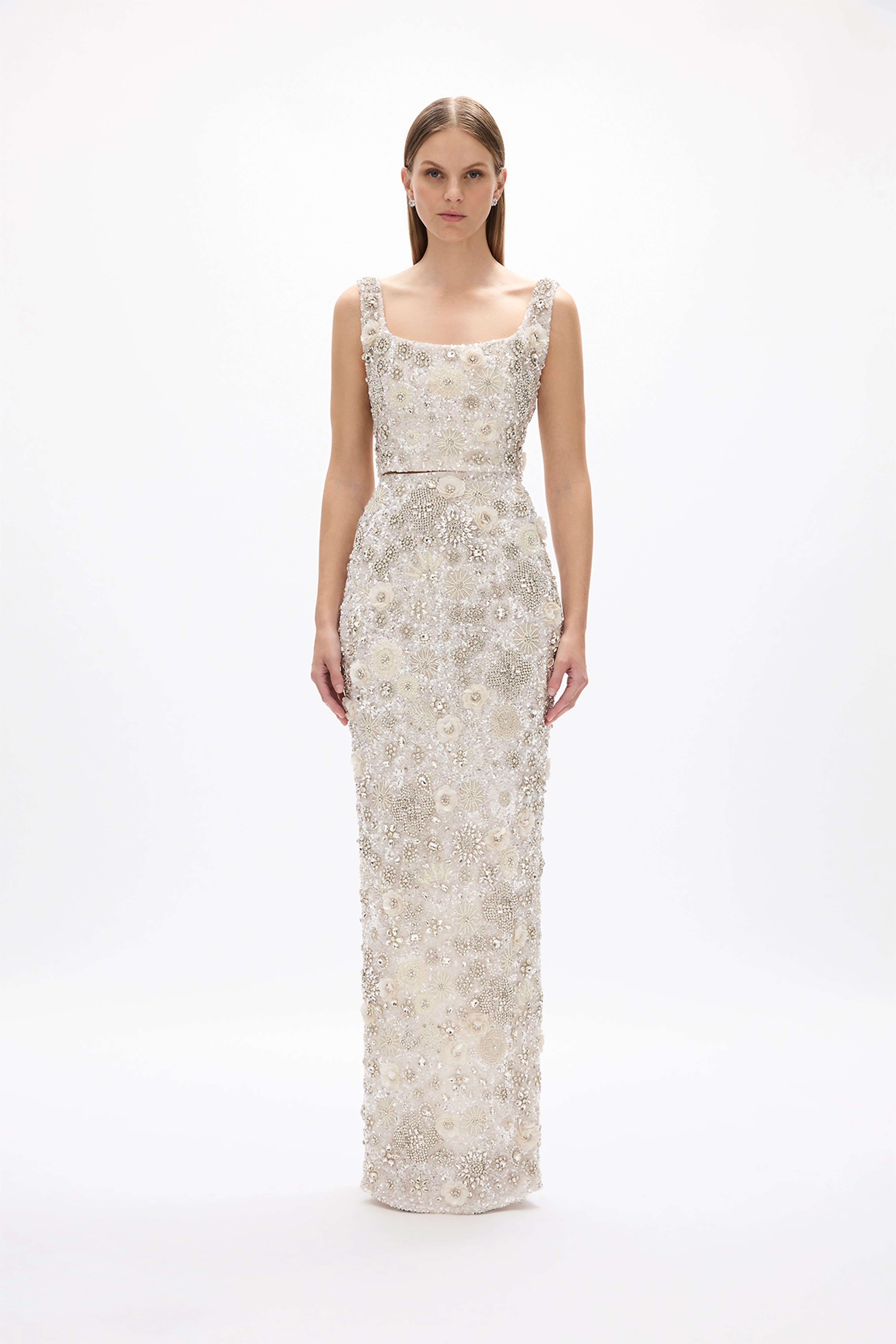 Details & Fit This style runs true to size, we recommend taking your waist measurement to indicate your size. This silhouette is designed to be form fitting. Model is 5'10 and wears a RG 1 = US 4 = AU/UK 8. Heel height is 12cm. Skirt length is 114 cm. - Fully hand embellished garment - Embellishment is on high stretch tulle base - Lining has multiple layers of tulle - Invisible white zip at centre back - Internal waist tape - Split at centre back of skirt - Fixed at the waist and has stretch through hips - Designed to sit at the waist Fabric & Care Hand Embellished Tulle Main: 100% Nylon Tulle Lining: 100% Nylon Spot Clean Only Do not Dry Clean, Do not Steam See sewn in label for further care instructions