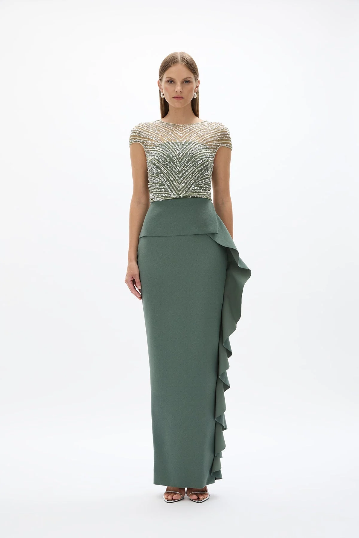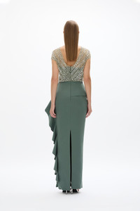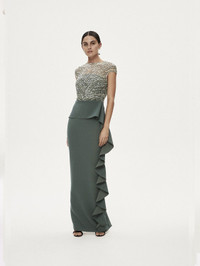 Core to Rachel Gilbert, the Gingette gown features an embellished bodice, with peplum detailed skirt falling to a floor grazing silhouette. Complete with a v shape open back and invisible zip closure. Our quintessential dress for the mothers of the bride. Size and Fit Runs true to size, we recommend taking your usual size. Model is 5'9 and wears a RG 1 = US 4 = AU/UK 8. - Strapless bodice with sheer embellished overlay - Cap sleeve - Maxi length - V-back detail - Invisible zip closure - Back split - Stretch in fabric Fabrication Dry clean only See sewn-in label for care instructions Care Hand Embellished 100% Nylon