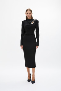Details & Fit Model is 5'10 and wears a RG 1 = US 4 = AU/UK 8. Heel height is 11cm.This style runs true to size, we recommend taking your waist and hip measurement to indicate your size. This silhouette is designed to be form fitting through to the hip. This fabric can be altered with ease. Both the skirt and sleeve lengths can be tailored by a professional seamstress. - Main fabric drapes over fully corseted internal bodice. - Bodice has boning and internal elasticated waist tape. - Asymmetrical neckline with slight cowl effect. - Fixed keyhole cut out. - Hand embellished knotted rope trim. - Center back split. - Hidden zip at centre back. - Elongated knuckle length sleeves. Fabric & Care Stretch Taffeta Main: 82.3% Acetate 17.7% Polyester Lining: 100% Polyester Dry clean only See sewn in label for further care instructions