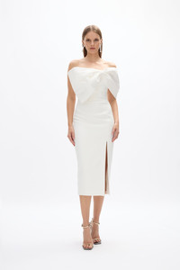 Signature to Rachel Gilbert, the Kace Dress features a soft textured bow draped across a strapless silhouette. Cut to a flattering column shape designed as a subtle statement with left side split. Size and Fit Runs true to size, we recommend taking your usual size. Model is 5'9 and wears a Rachel Gilbert Size 1 [AU/UK 8 | US 4]. - Voluminous bow detail - Fitted to the under bust - Internal boning in waist - Gripper tape across the neckline - Mid length - Back zip closure Fabrication Stretch Taffeta Bow & Carmine Skirt Main: 97% Polyester 3% Elastane Lining: 100% Polyester Care Dry Clean Only See sewn-in label for further care instructions