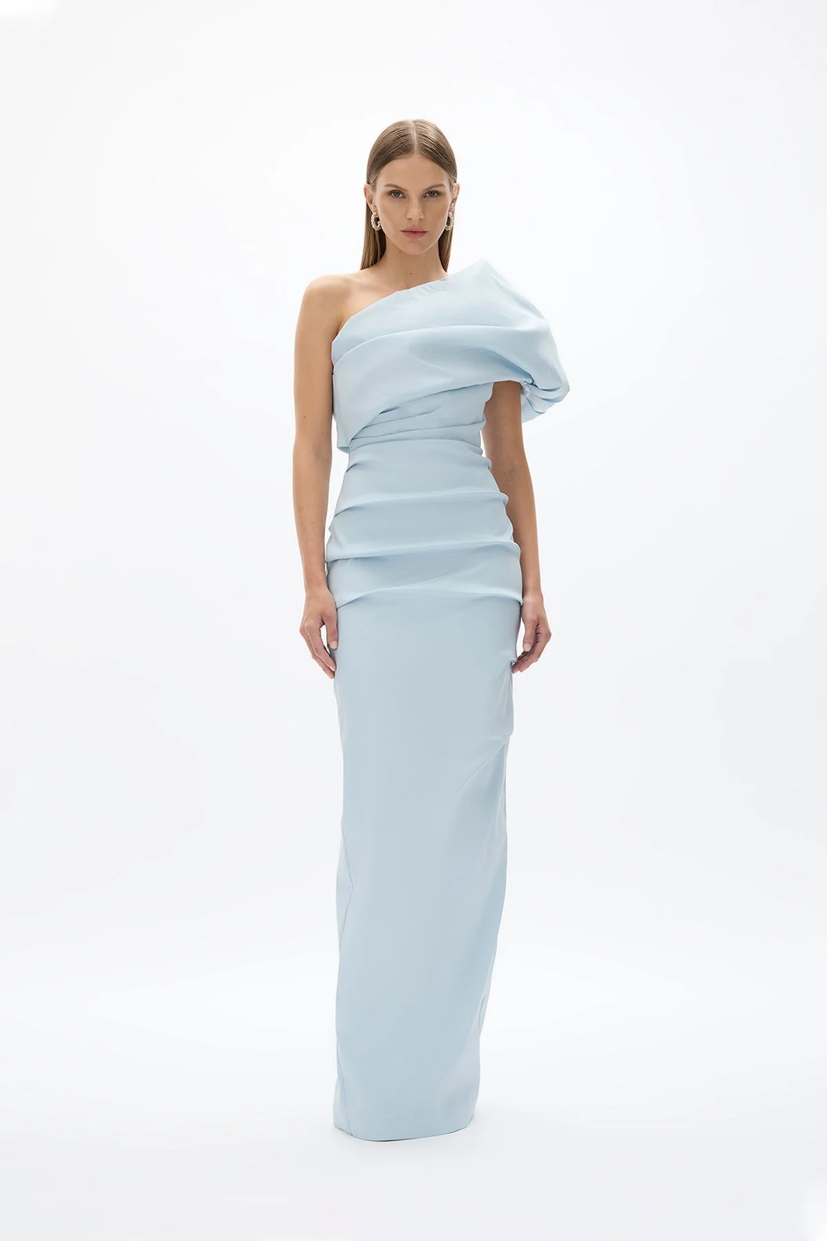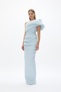 A modern adaptation of a one-shoulder gown, the Kat Gown features a voluminous, relaxed one-shoulder silhouette balanced by an internally structured fitted waistline to define shape. This silhouette balances paired-back exaggeration with a timeless approach by offering a quintessential event piece we will never fail to reach for. - Fitted bodice with internal boning - A slim fit silhouette - This fabric has stretch - Adjustable elastic waist tape to cinch in the waist - Silicone taping on the inside of the bust for a firm hold on the body - Elastic is stitched in to the sleeve for a close fit - This style can be hemmed - This style fits true to size Size and Fit Runs true to size, we recommend taking your usual size. Model is 5'10 and wears a Rachel Gilbert Size 1 [AU/UK 8 | US 4] Fabrication Stretch Taffeta 45% Nylon 50% Polyester 5% Elastane Care Dry Clean Only See sewn in label for further care instructions