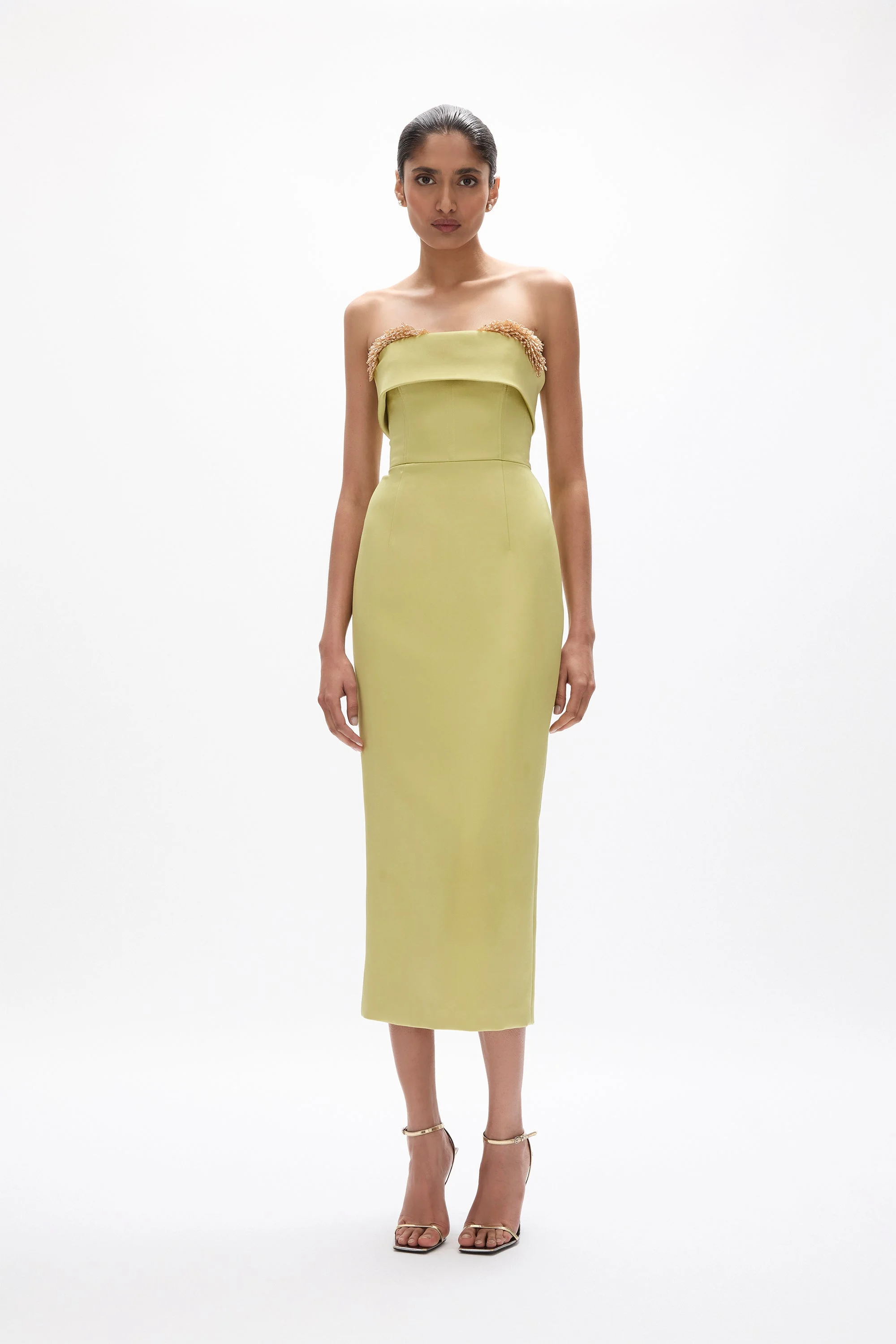 Details & Fit Form fitting strapless silhouette. Model is 5'10 and wears a RG 0 = US 2 = AU/UK 6\n • Internal bodice and corset. • Internal elastic waist tape. • Little stretch through the waist and bust. • Invisible zip. • Back split. • Slight sheen to fabric. • Hand embellished details across the bust. • Strapless silhouette. Fabric & Care Crepe back satin with light sheen 82% Acetate 18% Polyester Dry Clean Only. We recommend covering the beaded trim during care.