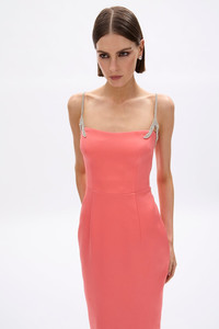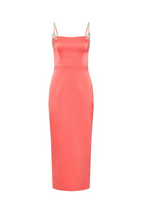 Details & Fit This style fits true to size; we recommend using your bust, waist, and hip measurements to select the size that most closely matches our size chart.Model is 5'8 and wears size RG 0 / US 2 - Midi column silhouette - Square neckline - Form fitting - Internal corset and waist tape - Hand-embellished shoulder straps - Gentle stretch through hips - Soft sheen satin finish - Back zip closure - Back split Fabric & Care Fabrication: Satin – 82.3% Acetate, 17.7% Polyester Care: Dry Clean Only Crafted from Satin, this fabric offers a smooth, lustrous finish with a soft drape that complements the structured internal corsetry. The surface sheen enhances the clean silhouette, while the embellished straps add refined texture. To preserve the delicate embellishment, avoid friction with textured surfaces and store the dress in a garment bag.