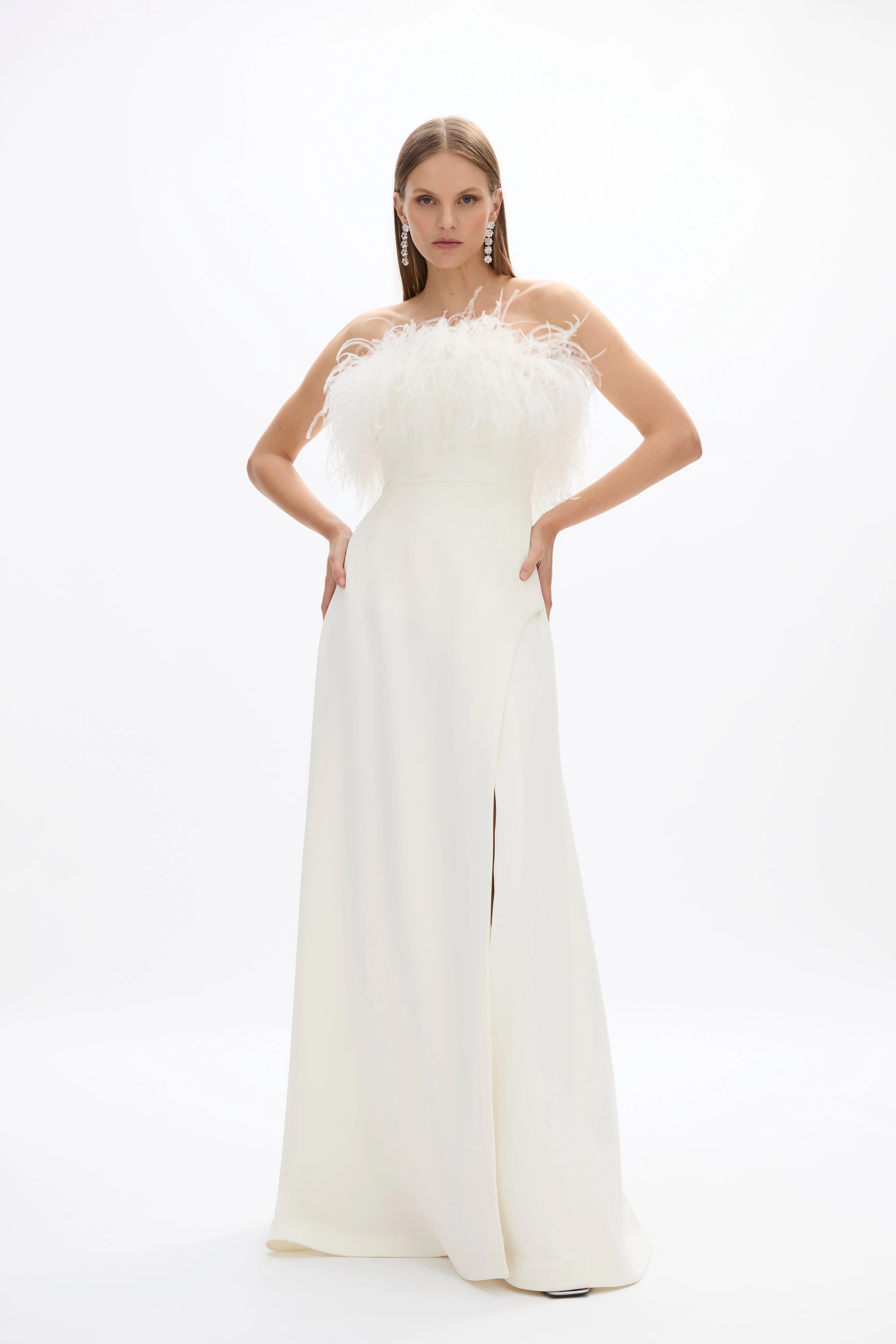 Details & Fit The internal construction of this style provides little stretch through the bust and waist, however it allows light stretch through the hips. We recommend taking your bust measurement to indicate your size. If you are in-between sizes we recommend sizing down. Model is 5'10 and wears a RG 0 = US 2 = AU/UK 6\n • Internal corset • Elastic waist tape • Little stretch through the waist and bust • Stretch through the hips • Back Split • Strapless Silhouette • Ostrich feathers across bust line • Elasticated strapless sleeves Fabric & Care Stretch Crepe Main: 95% Polyester 5% Elastane Lining: 100% Polyester Ostrich Feather detail Dry Clean Only See sewn in label for further care instructions