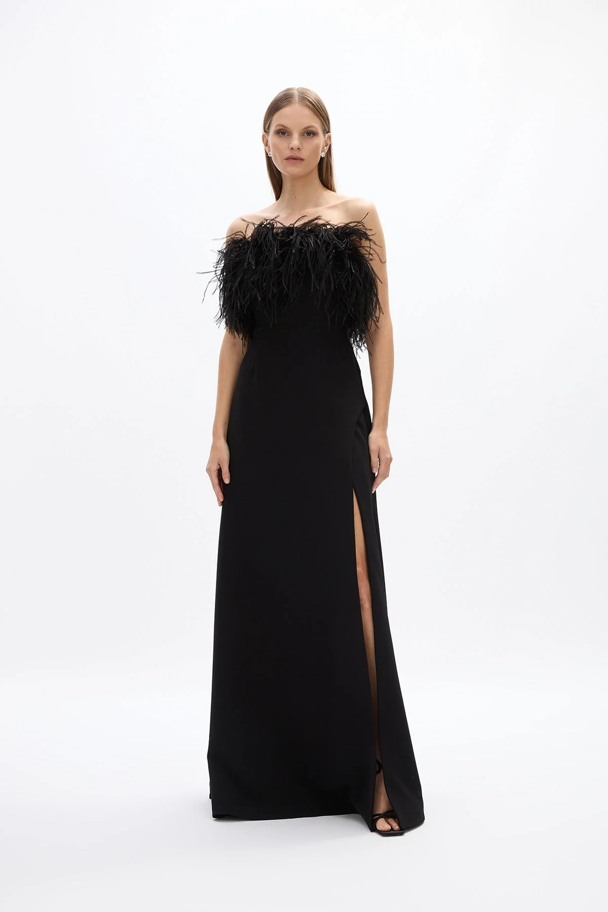 Details & Fit This is a form fitting silhouette. Model is 5'10 and wears a RG 0 = US 2 = AU/UK 6\n • Internal corset • Elastic waist tape • Little stretch through the waist and bust • Stretch through the hips • Back Split • Strapless Silhouette • Ostrich feathers across bust line • Elasticated strapless sleeves Fabric & Care Light Stretch Crepe Main: 95% Polyester 5% Elastane Lining: 100% Polyester Ostrich Feather detail Dry clean only See sewn-in label for care instructions