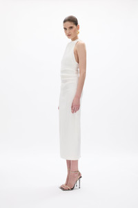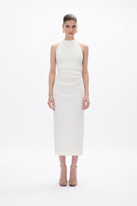 Details & Fit Runs true to size, we recommend taking your usual size. Model is 5'10 and wears a RG 1 = US 4 = AU/UK 8. - Looser fit through the bust - Column silhouette - Midi length - Halter neck - Detachable Bow - Lightly boned at waist - Invisible zip Fabric & Care Taffeta Main: 45% Nylon 50% Polyester 5% ElastaneLining: 100% Polyester