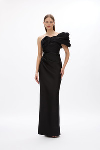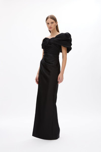 The Marlo Gown is a full-length style featuring ruching across the bodice, and sculptural detailing across the neckline and shoulders, staying true to the signature style of Rachel Gilbert pieces. - Off the shoulder draping with elastic inside the sleeves for a close fit - This fabric does not have any stretch - please consider your measurements at the largest point - Front side split - Gathered detailing across the bodice and skirt - This style can be hemmed - Centre back zip closure - Internal gripper tape along the bust - Internal boning Size and Fit Runs true to size, we recommend taking your usual size. Model is 5'9 and wears a Size 1 Fabrication Silk Wool 52% Wool 48% Silk Care Dry Clean Only See sewn in label for further care instructions