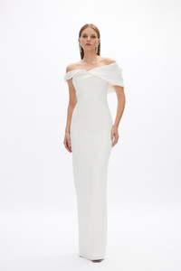 A classic silhouette crafted with a soft sweetheart neckline and off-the-shoulder straps falling to a full length silhouette. Detailed with signature Rachel Gilbert craftsmanship with internal corsetry to create waist definition and create a soft hour-glass shape. Size and Fit Runs true to size, we recommend taking your usual size. Model is 5'9 and wears a Rachel Gilbert Size 1 [AU/UK 8 | US 4]. - Fitted silhouetted - Maxi length - Off the shoulder - Fully boned - Adjustable elastic waist tape to cinch in the waist - Silicone taping on the inside of the bust for a firm hold on the body - Invisible back zip Fabrication Stretch Crepe Main: 71% Acetate 29% Polyester Lining: 100% Polyester Care Dry Clean Only See sewn in label for further care instructions