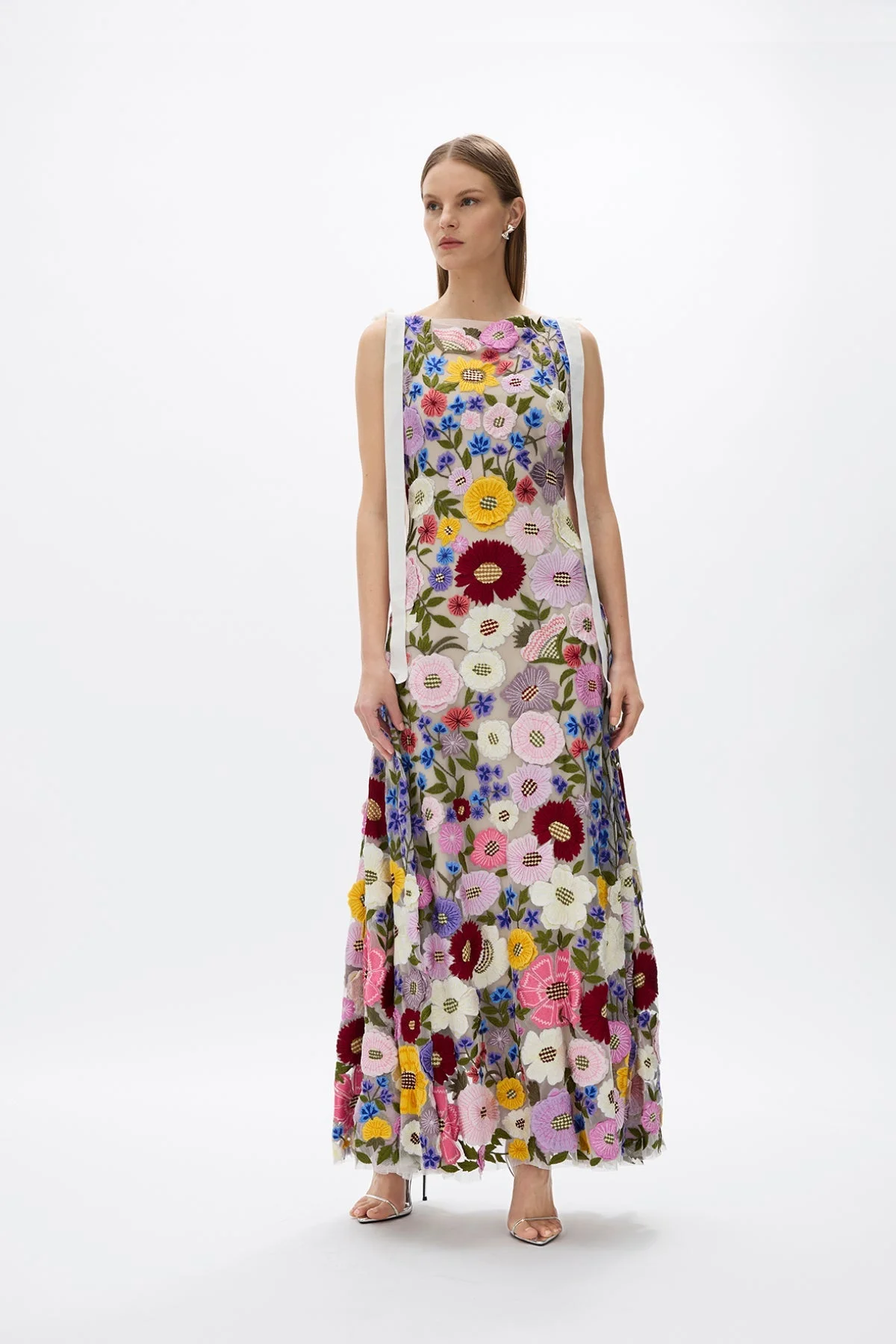 The statement silhouette of the season, the Nya Gown focuses on craftsmanship, featuring hand embroidered florals across a floor grazing silhouette. Complete with ribbon shoulder straps, and a cinched waist to accentuate shape. This style is sold with a slip. Size and Fit Runs true to size Fits close to the body, skims curves and doesn't cling. Model is 5'10 and wears a Rachel Gilbert Size 1 [AU/UK 8 | US 4] Fabrication Main: 100% Nylon Tulle Spot clean only See sewn-in label for care instructions