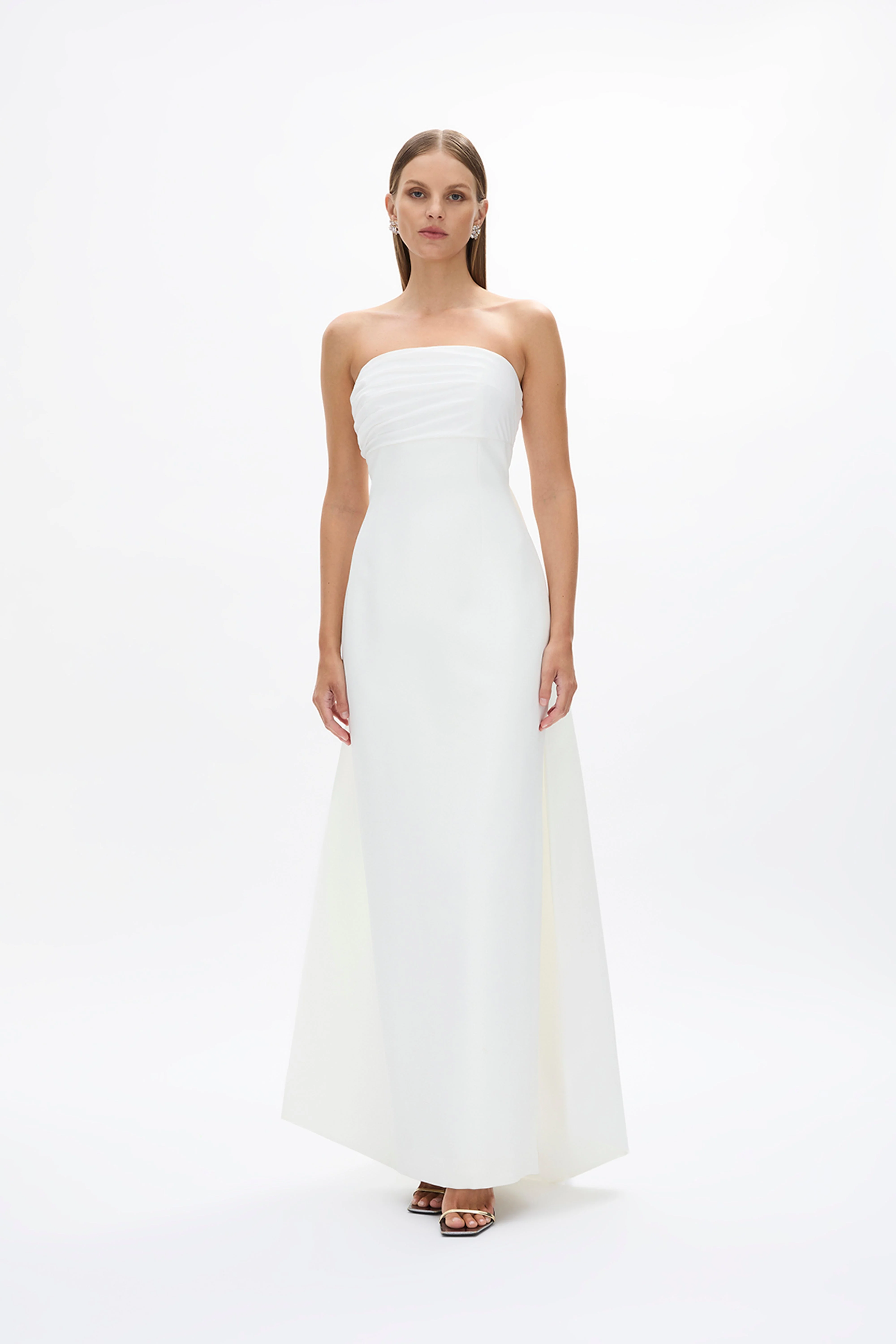 Details & Fit This style runs true to size, we recommend taking your bust and waist measurement to indicate your size. This silhouette is designed to be form fitting through to the hip. This garment can be altered with ease. The length of the garment and the train can be tailored by a professional seamstress. Model is 5'10 and wears a RG 1 = US 4 = AU/UK 8. Heel height is 11 cm. Dress length is 134 cm. - Matte taffeta contrast detail on a stretch crepe body - Drape is gathered over bust - Main body fabrication below under bust seam is stretch crepe - Split at centre back of skirt - Dramatic tie detail at centre back is secured in under bust seam - not removable - Zip at centre back - Silicone gripper tape at inside neckline top edge - structured full boning corset inside bodice - Elasticated waist tape - Column silhouette, designed to be form fitting. - Minimal stretch. Fabric & Care Bonded Crepe & Stretch Taffeta Main: 97% Polyester 3% Elastane Contrast: 88% Polyamide 22% Elastane Lining: 100% Polyester Dry clean only See sewn in label for further care instructions