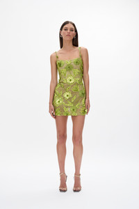 Details & Fit This style runs true to size, we recommend taking your bust and waist measurement to indicate your size, this silhouette is designed to be form fitting. Due to the nature of this garment, we do not recommend any alterations. This may compromise the garments finish and overall integrity.Model is 5'9 and wears a RG 1 = US 4 = AU/UK 8. Heel height is 12cm. - Hand embellished garment with glass beads and laser cut sequins - Tulle lining - Bodice has form fitting lining with high power stretch mesh and a fully boned corset - Adjustable straps with ring and slider at back of strap - Invisible zip Fabric & Care Hand Embellished Tulle Main: 100% Nylon Tulle Lining: 100% Nylon Spot Clean Only Do not Dry Clean, Do not Steam See sewn in label for further care instructions