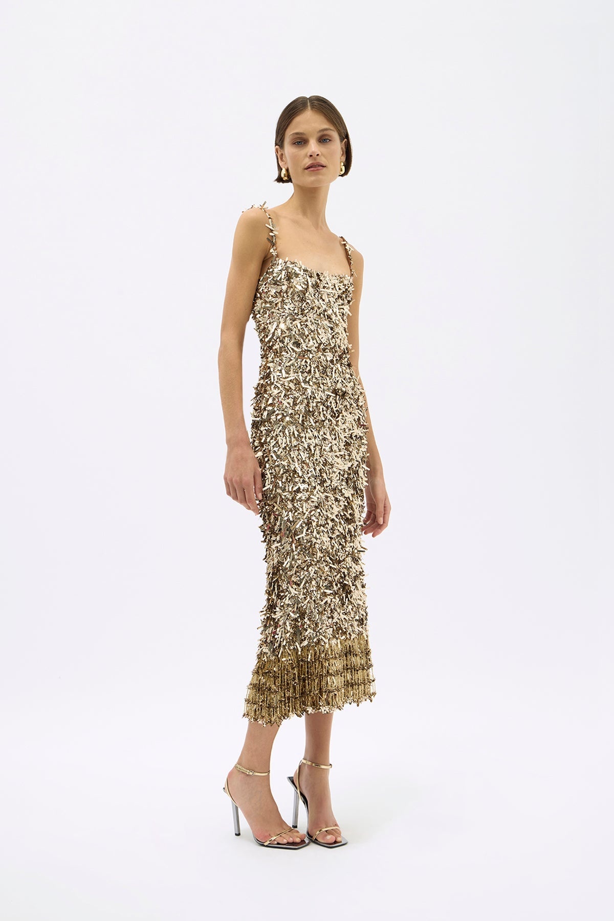 The Posie makes a powerful statement in gold. It’s crafted with subtle straps, a flattering square neckline and a column cut offset with a striped hem. The scattering of luminous sequins will make you opulently stand out at the dining table or dance floor. - Hand embellished detail - Fully boned bodice - Lining is high stretch for sculpting - Internal waist tape to cinch - Self tie straps - Midi length - Tasseled hem edge with fishtail skirt shape - This style fits true to size Size and Fit Runs true to size, we recommend taking your usual size. Model is 5'10 and wears a Rachel Gilbert Size 1 [AU/UK 8 | US 4]. Fabrication Embellished Tulle 100% Nylon Care Dry Clean Only See sewn in label for further care instructions