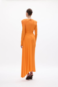 Details & Fit This style fits true to size; we recommend using your bust, waist, and hip measurements to select the size that most closely matches our size chart.Model is 5'8 and wears size RG 0 / US 2 - Midi silhouette - High neckline - Form fitting through bust and waist - Hand-draped ruching across bust and waist - Internal shoulder pads for structure - Side ankle-length train - Back zip Fabric & Care Fabrication: Jersey – 73% Polyamide, 27% Elastane Care: Dry Clean Only Crafted from Italian high-stretch jersey, this fabric provides a smooth, supportive fit with breathable comfort. Its elasticity allows for movement while maintaining the sculpted silhouette. To preserve the ruched detailing and shape, handle with care and store flat or on a hanger inside a garment bag.