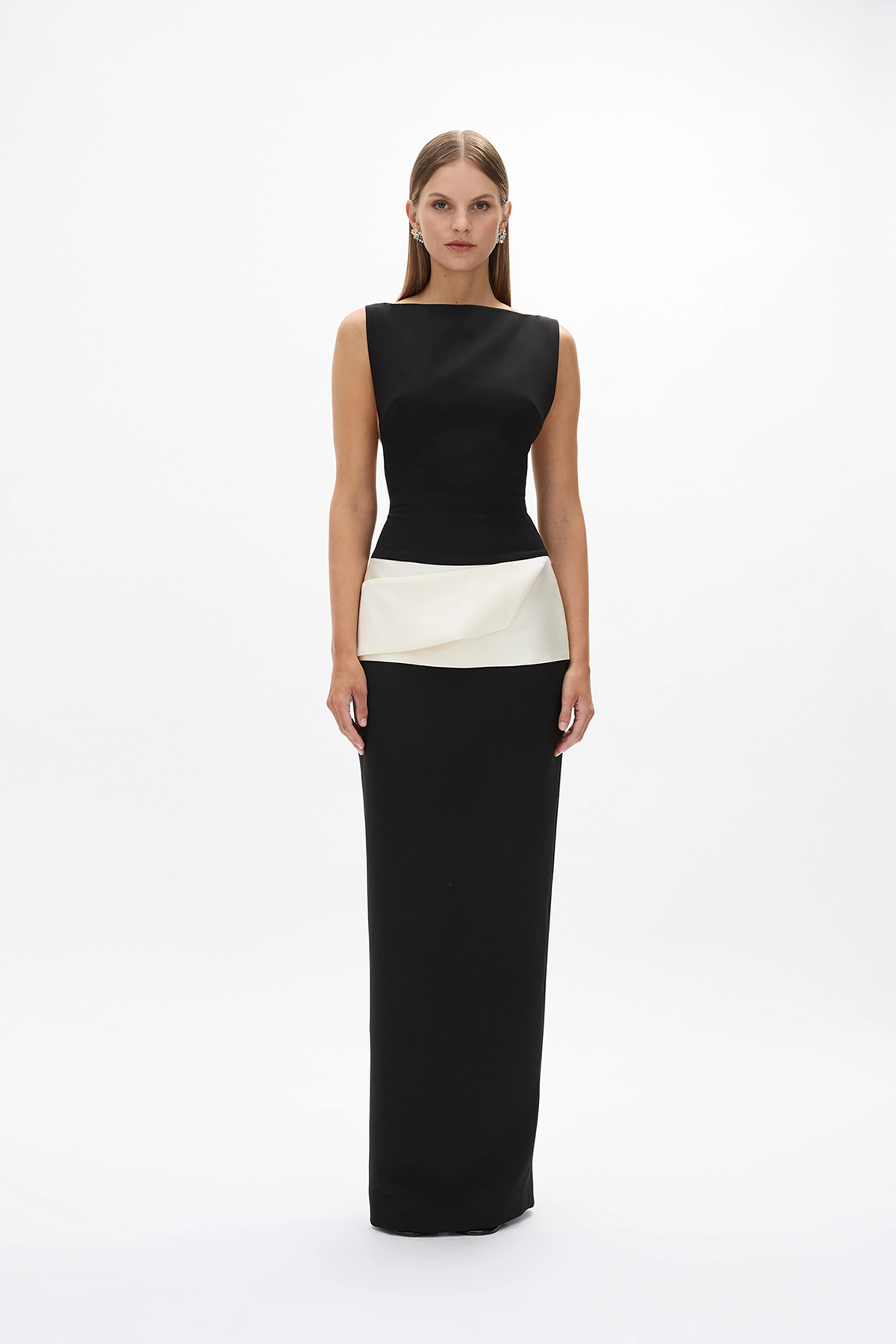 Details & Fit Model is 5'10 and wears a RG 1 = US 4 = AU/UK 8. Heel height is 12cm. Dress length is 156 cm. This style runs true to size, we recommend taking your waist and hip measurement to indicate your size. The length of this gown can be tailored with ease by a professional seamstress. Please note the contrast panel has no stretch and cannot be altered. - Figure skimming fit. - Elasticated waist tape. - Invisible zip at centre back. - Split at centre back skirt hem. - No stretch. - Draped non-removable sash around contrast panel. - Tightest area of dress is the hip - Contrast tulle V shaped insert at under arm Fabric & Care Stretch Crepe & Silk Wool Main: 95% Polyester 5% Elastane Contrast: 52% Wool 48% Silk Lining: 100% Polyester Spot Clean Only - No chemicals, Steam only Soak and rinse in plain cold water only, No detergents Do Not Clean with Petroleum or Hydrocarbon Solvents Do Not Wash Do Not Wet Clean See sewn-in label for further care instructions