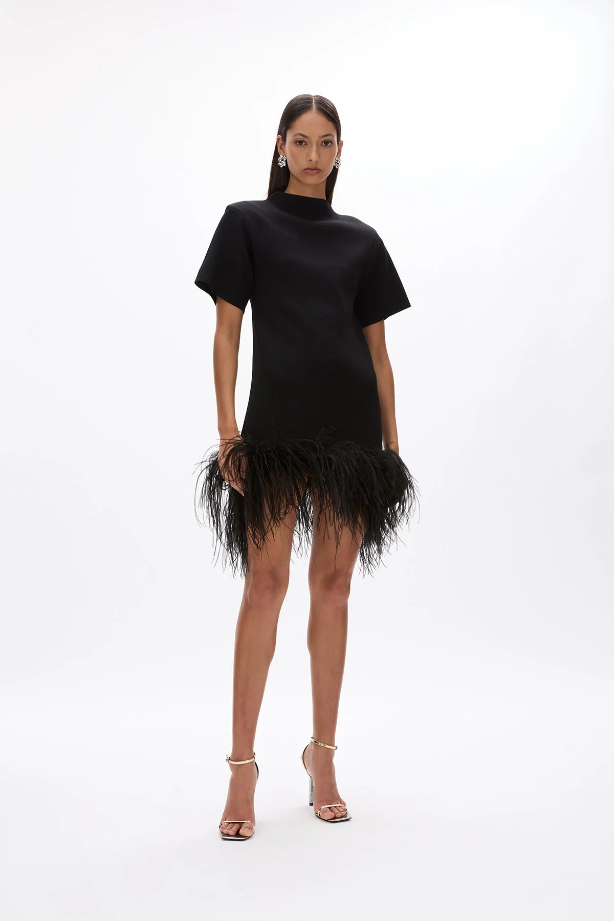 Inspired by the best-selling Linc mini, the Rita Mini is nothing short of a sartorial sensation. Made from midnight-black crepe, it has a modern turtleneck and cascades to an A-line hem. The floaty feathers will enhance movement on the dancefloor or at dinner. - Thick stretch knit - Keyhole & button closure at back neck - Shoulder pads - Mini length A-line skirt - Ostrich feathers at hem - Feathers can be removed for laundering - Designed to be loose fitting Size and Fit Runs true to size, we recommend taking your usual size. Model is 5'10 and wears a Rachel Gilbert Size S [AU/UK 8 | US 4] Fabrication Crepe Knit 63% Viscose 37% Nylon Crepe Knit Care Dry Clean Only See sewn in label for further care instructions