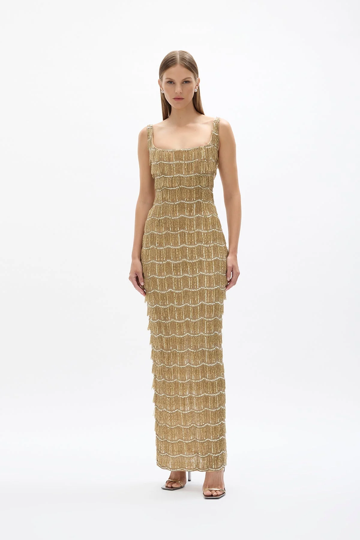 The Sadie Gown embodies structural design whilst embracing feminine form. This square neck style features internal boning to create shape and provide support through the bodice, and falls to a a floor grazing length. The Sadie Gown is adorned with hand placed beaded fringes throughout. - This product has internal boning - The beaded tassel placement is unique on each garment as they are hand-placed & sewn - This product features a scallop detail on the hem - This is a fitted, pencil skirt style - This product can be heavy on the body Size and Fit Runs true to size, we recommend taking your usual size. Model is 5'9 and wears a Size 1 Fabrication Beaded Tulle 100% Nylon Care Dry Clean Only See sewn in label for further care instructions