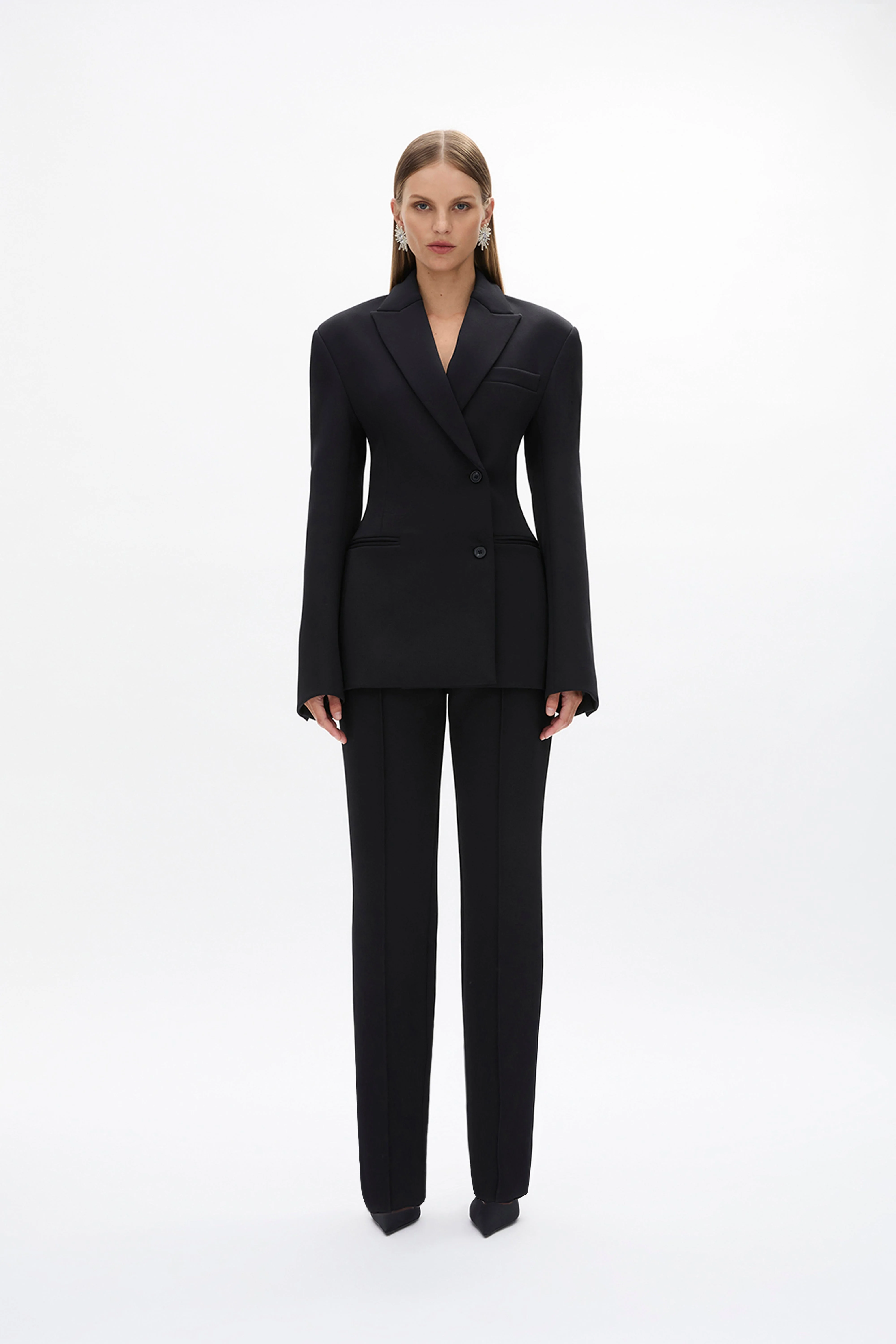 Details & Fit This style runs true to size, we recommend taking your waist measurement to indicate your size. If you are in between sizes, we recommend sizing up. This garment can be altered with ease. The blazer length and sleeve length can be easily tailored by a professional seamstress. Model is 5'10 and wears a RG 1 = US 4 = AU/UK 8. Heel height is 11cm. - Acetate blend twill suiting fabric. - Structured shoulder pads. - Contoured seams create waist shaping. - Faux welt pocket at wearers left front chest. - Functional Jett pockets at low hip. - 1 concealed button on inside wrap. - Rachel Gilbert branded chain at inside back neckline - Functional vent at back of 2 piece sleeve with 4 stacked functional buttons. - Vent at centre back hem. - Elongated knuckle length sleeve. Fabric & Care Suiting Main: 12.5% Acetate 87.5% Polyester Lining: 100% Polyester Dry clean only See sewn in label for further care instructions