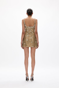 Details & Fit Form fitting silhouette. Model is 5'10 and wears a RG 0 = US 2 = AU/UK 6\n • Internal bodice and corset. • Internal elastic waist tape. • Little stretch through the waist and bust. • Garment designed to skim the hips. • Hand embellished with metal beads. • Square neckline. • Micro mini length Fabric & Care Hand Embellished on Nylon Tulle 100% Nylon Tulle Dry Clean Only. Please refer to the care guide provided with the garment for additional care instructions.