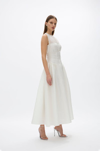 Designed for the days that turn into nights, the Sophia Dress features a slim-fitting bodice hugging through the waist to accentuate the shape, falling to a relaxed mid-length silhouette. This style features a textured fabric with piping detail. Size and Fit Runs true to size, we recommend taking your usual size. Model is 5'9 and wears a Rachel Gilbert Size 1 [AU/UK 8 | US 4]. - Textured fabric - Flared silhouette - Midi length - Round neckline - Sleeveless - Invisible back zip Fabrication Textured Jacquard Main: 56% Polyester 44% Nylon Care Dry Clean Only See sewn in label for further care instructions