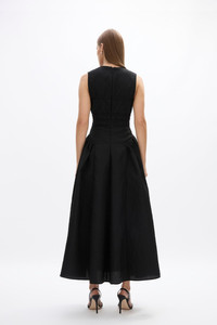 Designed for the days that turn into nights, the Sophia Dress features a slim-fitting bodice hugging through the waist to accentuate the shape, falling to a relaxed mid-length silhouette. This style features a textured fabric with piping detail. Size and Fit Runs true to size, we recommend taking your usual size. Model is 5'9 and wears a Rachel Gilbert Size 1 [AU/UK 8 | US 4]. - Textured fabric - Flared silhouette - Midi length - Round neckline - Sleeveless - Invisible back zip Fabrication Textured Jacquard Main: 56% Polyester 44% Nylon Care Dry Clean Only See sewn in label for further care instructions