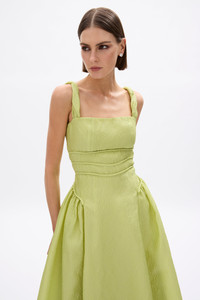 Details & Fit Fitted at the body with a slightly relaxed bust; we recommend using your bust, waist, and hip measurements to select the size that most closely matches our size chart.Model is 5'9 and wears size RG 0 / US 2 - Fit and flare midi silhouette - Square neckline - Dramatic, voluminous skirt - Fitted through the waist - Textured jacquard fabric - Back zip Fabric & Care Textured Jacquard Main: 56% Polyester 44% Nylon Dry Clean Only See sewn in label for further care instructions
