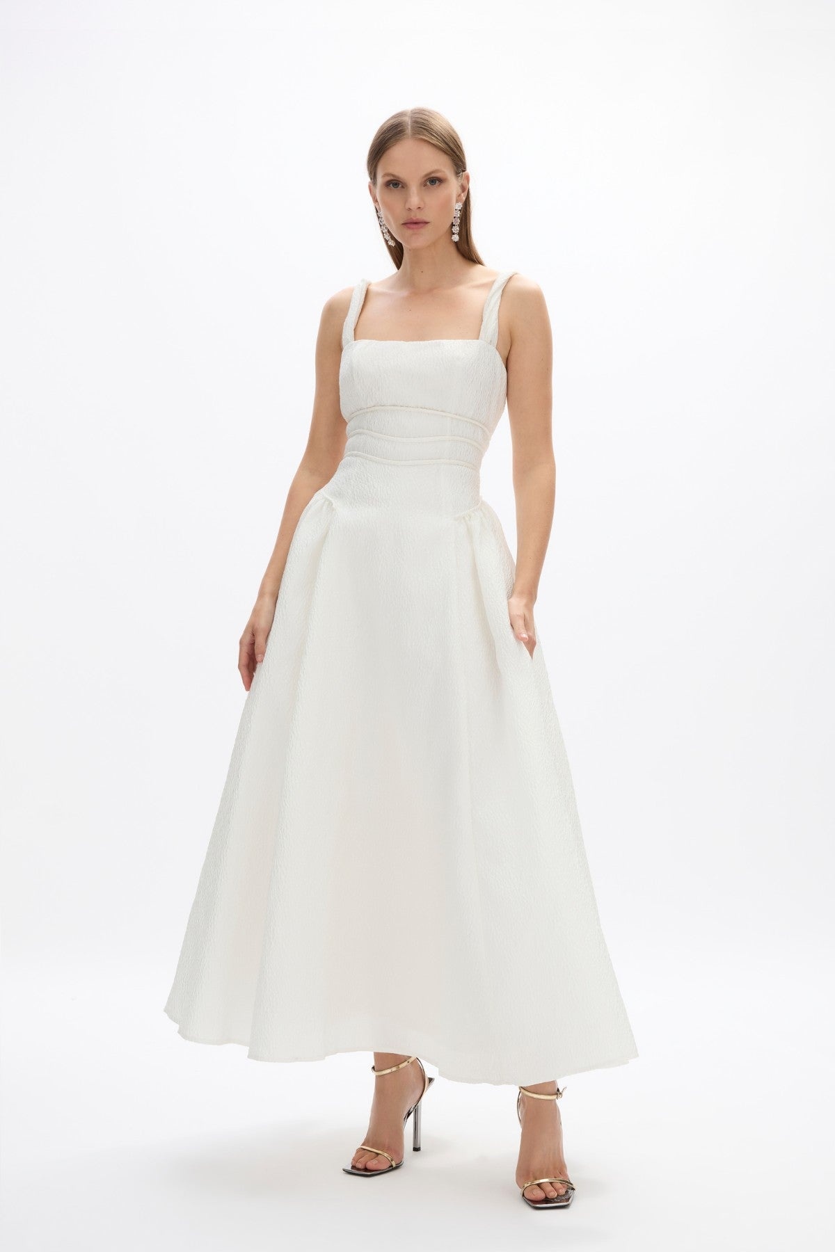 A voluminous, feminine style, the Sophia Strap Dress is a must have for every wardrobe. Featuring a cinched waist alongside a full skirt to create definition and shape. Size and Fit Runs true to size, we recommend taking your usual size. Model is 5'10 and wears a Rachel Gilbert Size 1 [AU/UK 8 | US 4]. - Twisted strap detail - A fit and flare silhouette - Square neckline - Mid length - Voluminous skirt - Back zip closure - No stretch in fabric Fabrication Textured Jacquard Main: 56% Polyester 44% Nylon Care Dry Clean Only See sewn in label for further care instructions