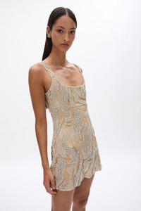 Details & Fit This is a body skimming mini silhouette. Model is 5'10 and wears a RG 0 = US 2 = AU/UK 6 •• Internal corset and bodice. • Square neckline. • No stretch through waist and bust. • Slight give through hips. • Relaxed fitting through the skirt. • Hand embellished. • Fully lined. Fabric & Care Embellished Nylon Tulle Lining: 100% Nylon Dry Clean Only See sewn in label for further care instructions