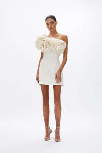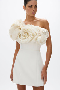 Details & Fit This style is a strapless mini silhouette. • Fitting through the bust and waist. • No stretch through the bust and waist. • Hand draped and placed silk organza floral bust detail. • EInternal corset and bodice. • Internal waist tape. • Back Zip. • Relaxed fitting skirt designed to sit slightly off the body. Fabric & Care Stretch Crepe Main: 96% Viscose 4% Spandex Contrast: 100% Silk, Lining: 100% Polyester Dry clean only See sewn in label for further care instructions