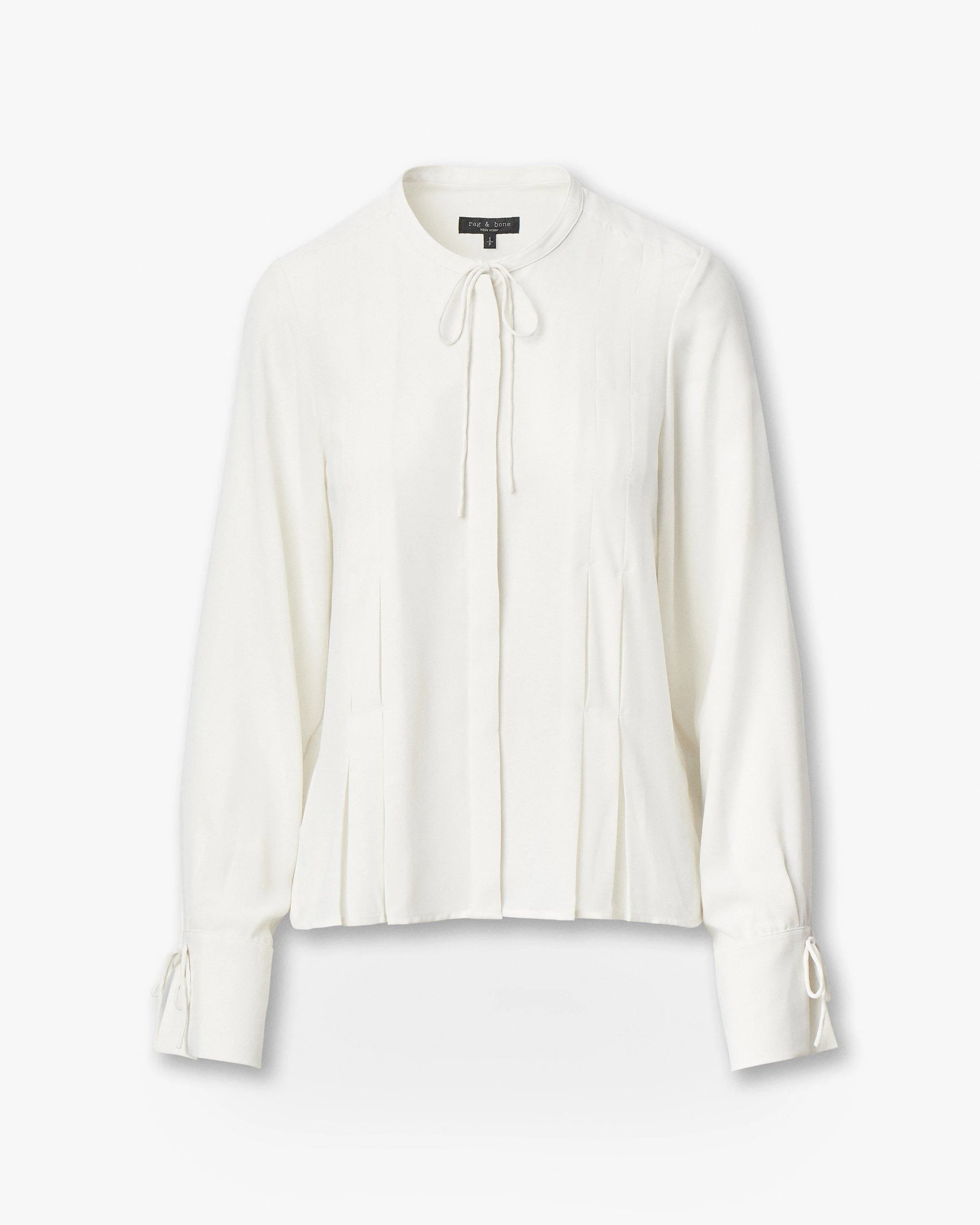 Easy and chic. This pleated blouse is a lightweight silhouette with a loose yet elegant drape that falls around the hips. Feminine ties at the neck and cuffs can be knotted or worn undone for an effortless look. Made for days at the office that lead to dinner plans at night. Size & Fit • Fits loose to body • Fits true to size • Size small: Back length 23.25", chest 41", sweep 41.25", sleeve length 33.25" • Model is 5'8" wearing size small Features & Details • 100% polyester • Hidden button front closure • Exposed faux horn buttons at cuffs • Front and back inverted box pleats • Ties at cuffs • Unlined • Machine wash cold & tumble dry low • Imported Product ID: RA4K25HSMSW