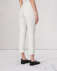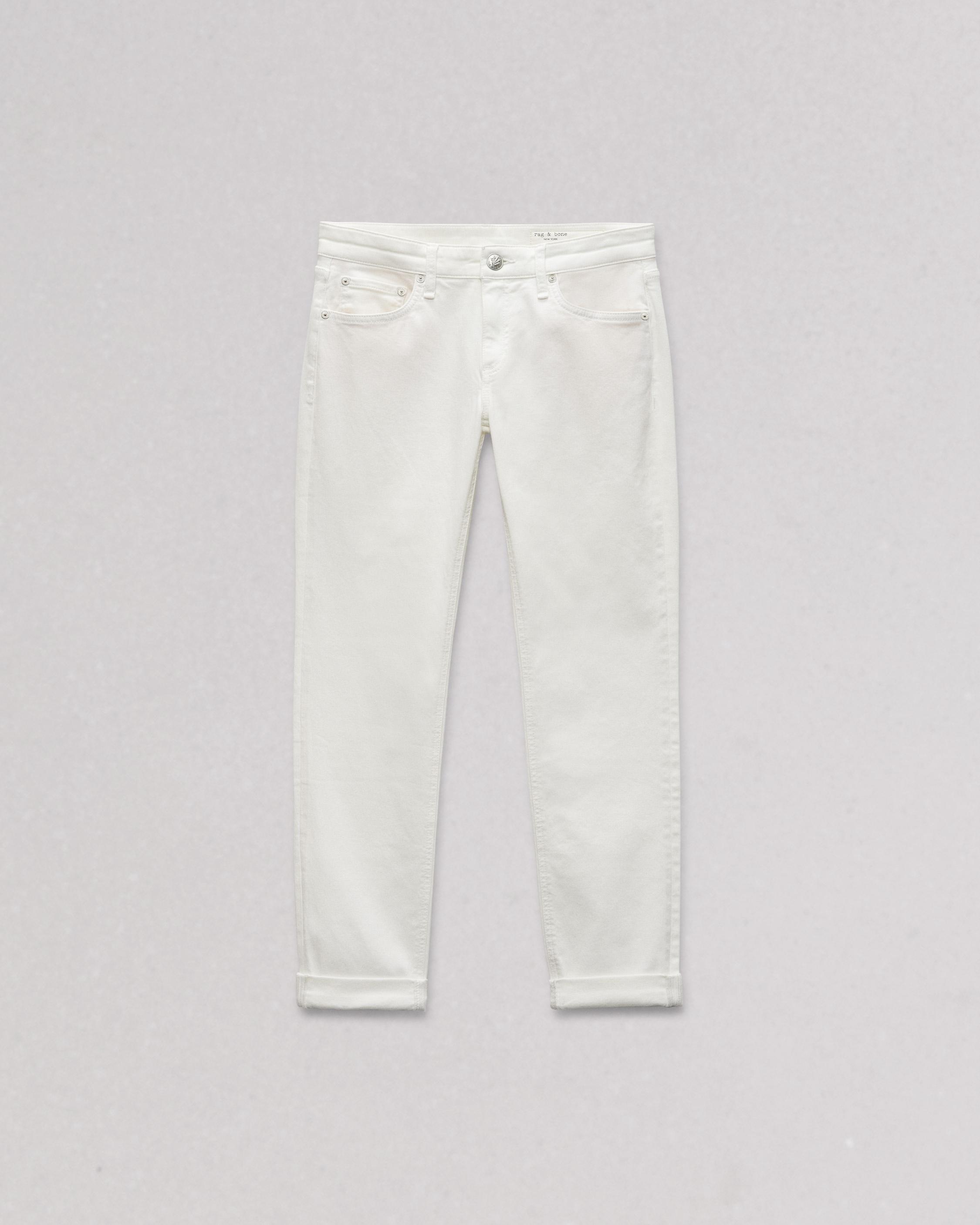 The Dre Slim Boyfriend. A low-rise slim fit pulled straight from the archives and evolved for today. Crafted from our Vintage Stretch denim for an archival look with just a touch of stretch. In Optic White, a true bright white. Size & Fit Low-rise slim fit, ankle length Size 26: 31.5" waist, 39.25" hip, 8.75" rise, 30" inseam (cuffed to 27"), 13" leg opening Model is 5'8.5" wearing a size 25 Features & Details 91% Cotton 8% Polyester 1% Elastane Vintage Stretch, Optic White Machine wash cold inside out with like colors, do not use bleach, hang to dry, use warm iron if necessary, color transfer may occur Signature dagger shank button at center front with a zipper fly, metal rivets Zipper fly Five-pocket silhouette Imported Product ID: WDD24S2643L6OW