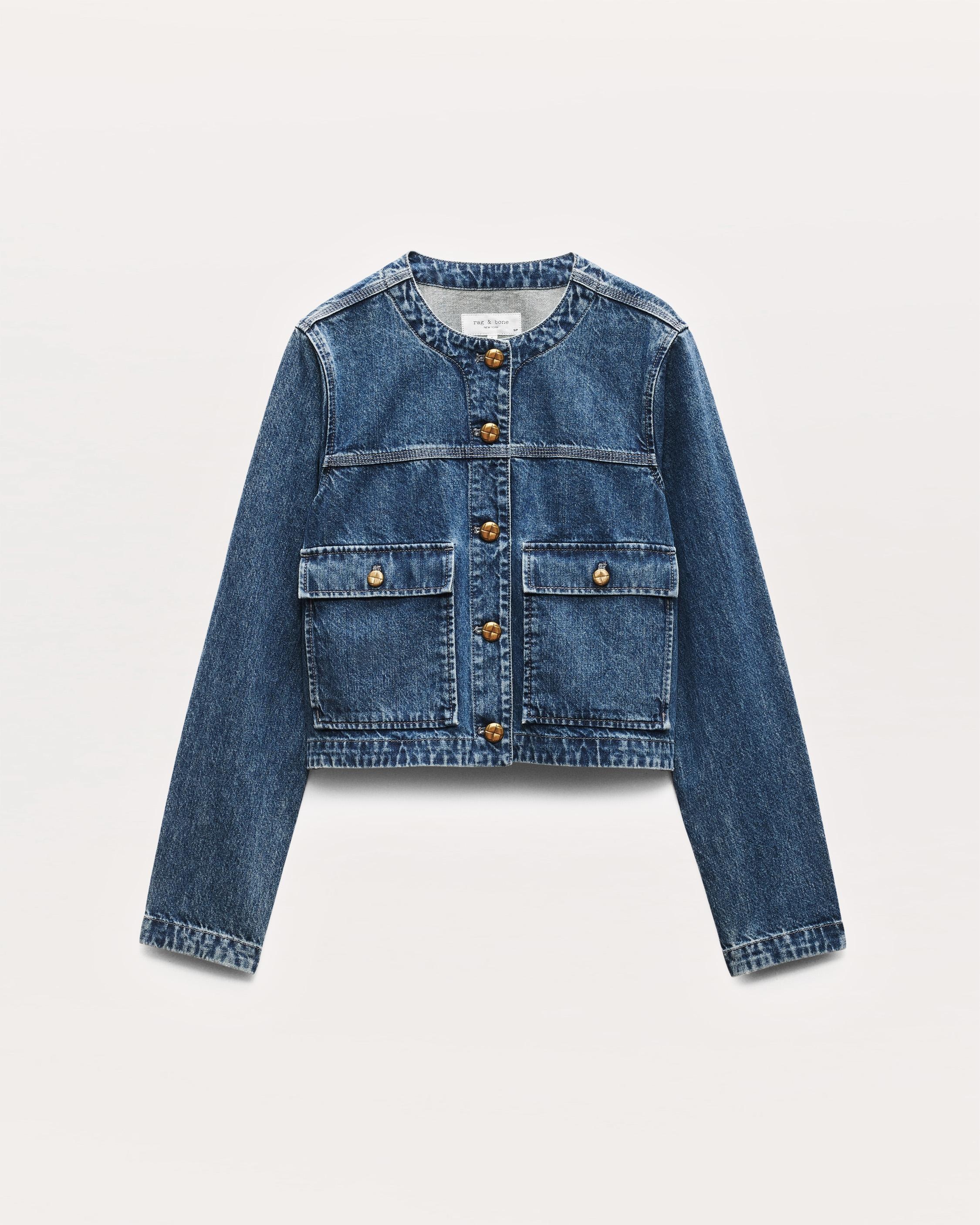 Classics. For a new era. This modern, rugged twist on the lady jacket is crafted from our Lightweight Rigid non-stretch denim that provides structure, but breaks in over time for a soft and comfortable feel. Braid-embossed metal buttons add a chic contrast. Size & Fit Fits true to size Size Small: Front length 20 1/4",back length 19 1/2", chest 38 1/4", sleeve length 32 1/2" Model is 5'10.5 wearing size small Features & Details 100% Cotton Lightweight Rigid Denim in Adeline, a medium indigo wash Machine wash cold inside out with like colors, gentle cycle, do not use bleach, hang to dry, low iron if need, color may transfer Signature braided shank button at center front Front button closure Imported Product ID: WDD25S1495RGAD