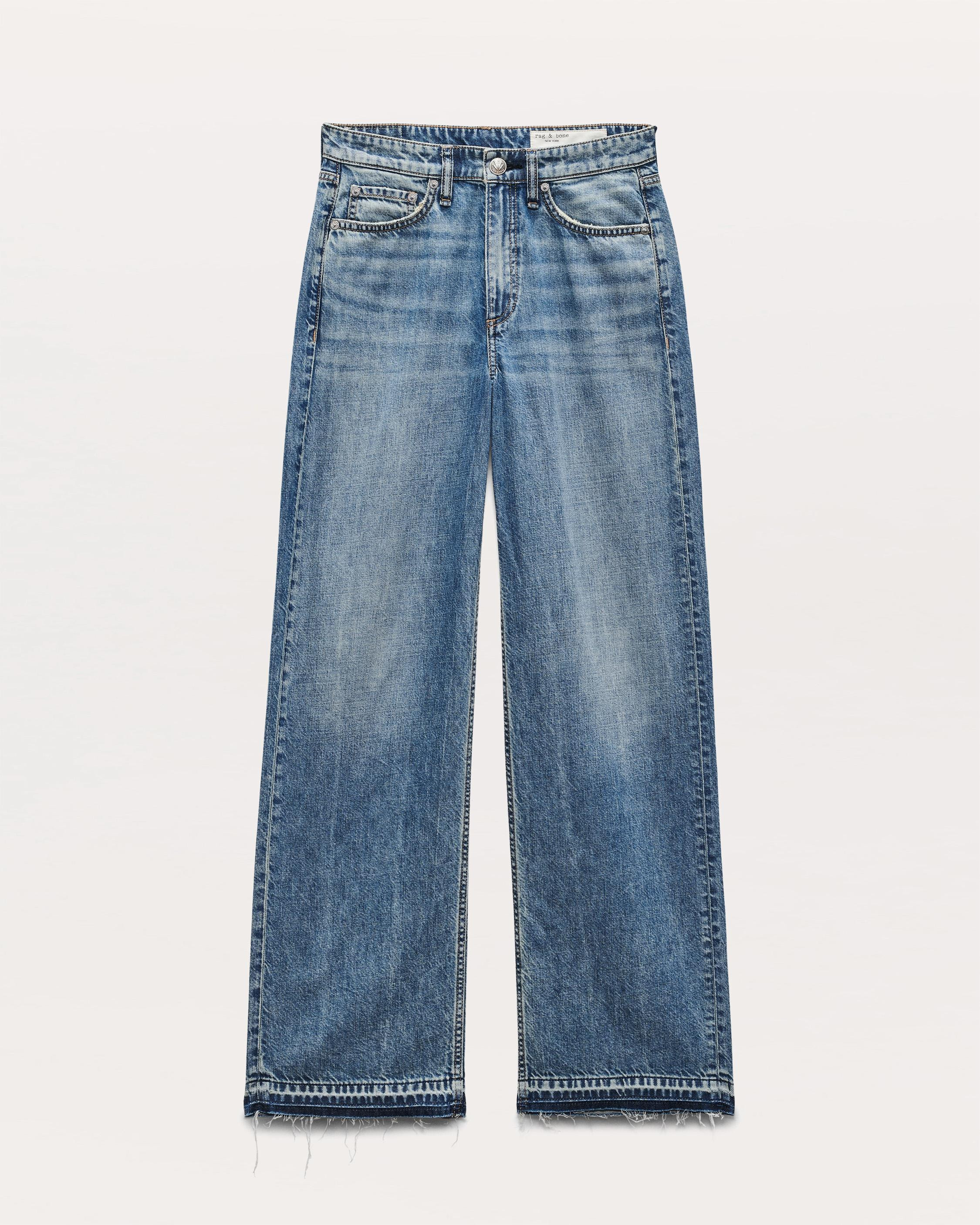 The Logan. Our laid-back, mid-rise jeans with a roomy fit through the hip and thigh down to a released hem. (Pro tip: Take your natural size and wear low on your waist for a relaxed look, or size down for a higher rise.) Crafted from our Featherweight denim that's supremely soft and super light, with an easy drape. In Orian, a light indigo wash. Size & Fit Mid-rise, wide leg, full length Size 26: 11 5/8" front rise, 31 1/2" inseam, 20" leg opening Model is 5'10.5 wearing size 25 Features & Details 64% Cotton, 36% Lyocell Featherweight Denim in Orian, a light indigo wash. Machine wash cold inside out with like colors, gentle cycle, do not use bleach, hang to dry, low iron if need, color may transfer. Zip fly with signature dagger button closure and metal rivets Five-pocket silhouette Imported Product ID: RJ2525F1FOR