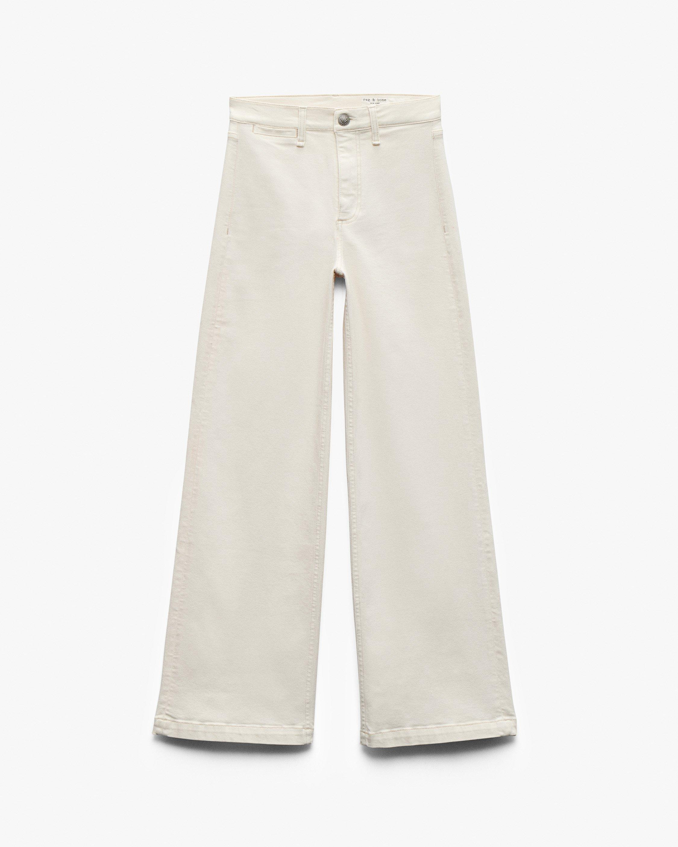 The Hadley. Our new high-rise, figure-flattering jeans with sculpted legs that gradually widen. In Ecru, a cream wash. Size & Fit • High-rise, wide leg, full length • Size 26: 11 1/2" front rise, 32" inseam, 22 1/2" leg opening • Model is 5'11" wearing size 25 Features & Details • 77% Cotton 16% Lyocell 5% Polyester 2% Elastane • Signature dagger shank button at center front with a zipper fly, metal rivets, clean hem • Center front shank button and zip closure • Back pockets • Machine wash cold inside out with like colors, gentle cycle, do not use bleach, hang to dry, low iron if need, color may transfer • Imported Product ID: RJ2025H1XEC