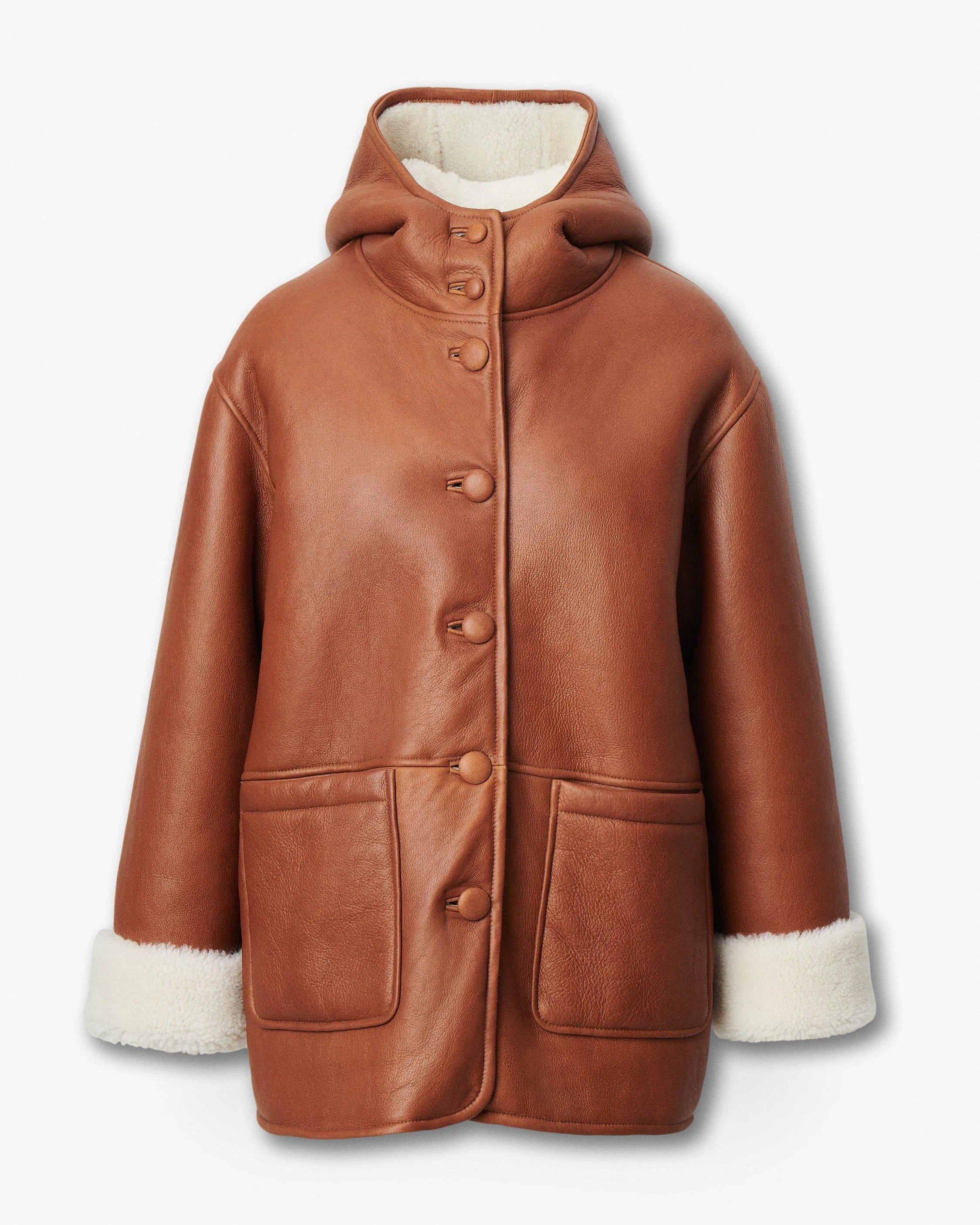 Elevated texture. This hooded coat is cut for an oversized fit from pure, full-grain lambskin in a custom earthy brown that's all rag & bone. It's lined entirely in plush, contrast shearling that's as chic as it is cozy. Pair yours with denim as you stay warm in style. Size & Fit • Oversized fit • Fits large to size. Consider sizing down for a closer fit. • Size small: Body length 30", back length 28.5", chest 48.5", sleeve length 34" • Model is 5'9" wearing size small Features & Details • 100% lamb shearling • Button front closure • Leather covered buttons at center front • Leather backing buttons • Two patch hip pockets • Professional leather clean only • Imported. Italian materials. Product ID: RA9W25H0MLT