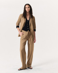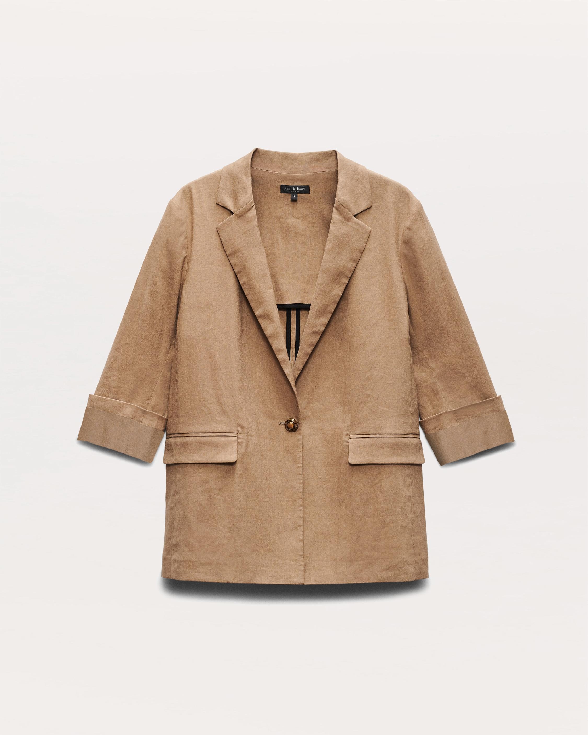 The kind of wear-with-everything wardrobe essential that looks polished, but feels effortless. This laid-back blazer is tailored from an airy linen blend and secures with a single, vintage-inspired metal button. Its three-quarter sleeves are perfectly cuffed to show a bit of its contrast sleeve lining. Size & Fit Classic fit with 3/4 sleeves Size 4: Front length 28 1/4", back length 26 3/4", chest 40 1/4", sleeve length 25 1/4" Model is 5'10" wearing size 2 Features & Details Body: 52% Linen, 46% Viscose, 2% Spandex Sleeve Lining: 100% Polyester Sleeve lining Dry clean only Front button closure Hip welt pocket with flap inserted Imported Product ID: WAW25S4020S220