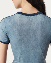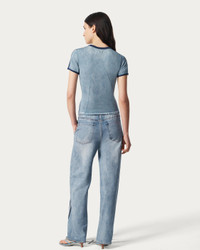 Whether you're getting to know (or already adore) Miramar, our revolutionary printing technique that makes any material look like denim, you'll love it in our new jersey fabric. This modern take on the baby tee is cut and sewn from stretchy, ultra-soft jersey that's printed on the outside to look like a denim T-shirt. It features a contrast collar, cuffs, and sporty stripes along the sleeves, plus our signature V-seam detailing at the back. Breathable and figure-flattering, the unlined style further achieves its comfortable fit and feel with the other seams and denim details digitally printed on the fabric. Size & Fit • Slim fit • Fits true to size • Size Small: Back length 19.5", chest 30", sweep 29.5", sleeve length 5.75" • Model is 5'11" wearing size small Features & Details • 95% modal, 5% spandex • Machine wash cold inside out & tumble dry low • Trompe l'oeil denim print on jersey fabric • Printed seams and shoulder tape • Unlined • Imported Product ID: RC4625PSMJR