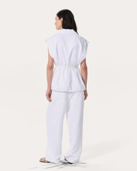 Inspired by vintage sportswear. Made for today. Designed as the ideal transitional layer, this oversized vest is crafted from a luxe, lightweight fabric that feels both satiny and airy. Details like the hidden zip- and snap-up front and neck and cinchable drawstring waist give you endless ways to wear it. Take your typical size for its intended looser look, or size down for a closer fit. Size & Fit • Relaxed fit • Fits large to size. Consider sizing down for a closer fit. • Size Small: front length 28.5" | back length 28" | chest 45.5" • Model is 5'11" wearing size small Features & Details • 77% viscose, 23% linen • Hidden zip and snap closure • Hidden snaps at center front and cuffs, bungee cords with stoppers at waistband and hem, eyelets at bungee cord openings, metal zippers at center front and pocket openings • Fully lined • Hip besom pockets with hidden zippers • Dry clean only • Imported Product ID: WAW25P40062906