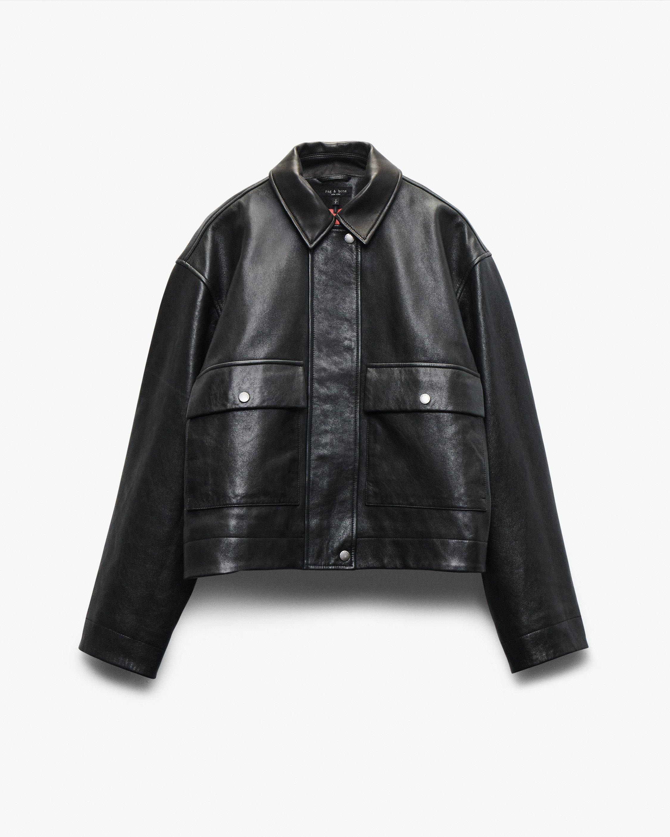 One of our best-selling jackets. Updated in soft-yet-structured lambskin with a vintage-inspired, lived-in look and feel. Combined with a cropped, boxy fit and a silky quilted lining, this is the one you'll reach for every season, year after year. Size & Fit • Croppped fit, slightly oversized • Fits true to size • Size Small: Body length 23.5", back length 22.75", chest 47", sleeve length 33" • Model is 5'11" wearing size small Features & Details • Body & collar: 100% lamb leather • Lining: 100% polyester • Professional leather cleaner only • Hidden zipper at center front • Exposed and hidden snaps at center front flap, collar & pockets • Patch pockets on front • Zipper and snap closure • Imported Product ID: RA5A25F0MCR